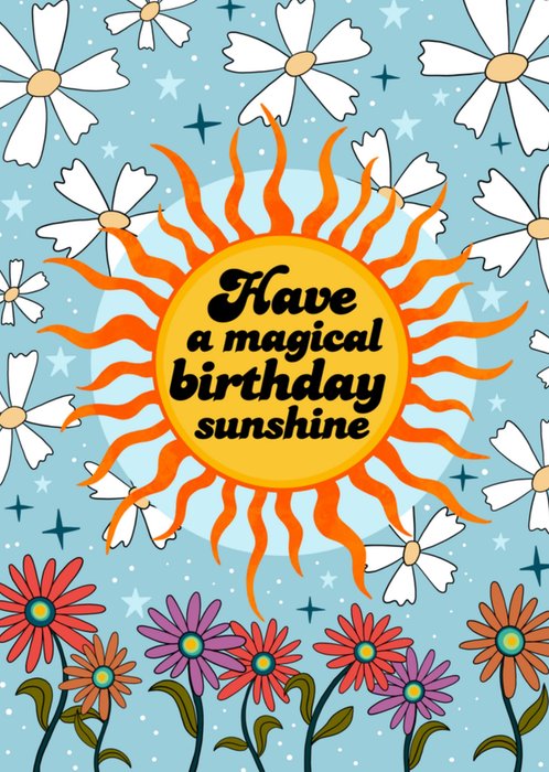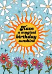 Leuke verjaardagskaart met bloemen en een zonnetje. Op de kaart staat: Have a magical birthday sunshine
