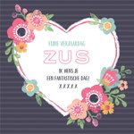 Fleurige bloemenkaart voor een jarige zus met de tekst: Zus ik wens je een fantastische dag! xxxx