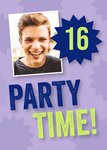 Nodig iedereen uit voor je verjaardagsfeest met deze fotokaart. Op de kaart kan je zowel de foto als de tekst aanpassen. Verder staan er paarse vlekken op de achtergrond.