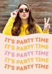 Op deze uitnodigingskaart van de Greetz designers staat de tekst: It's party time. Op de linkerkan van de kaart kan je je eigen foto toevoegen.