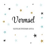 Leuke vormsel kaart met allemaal gekleurde sterren erop en de tekst: Vormsel. Gefeliciteerd Anna. De naam op de kaart is aanpasbaar.