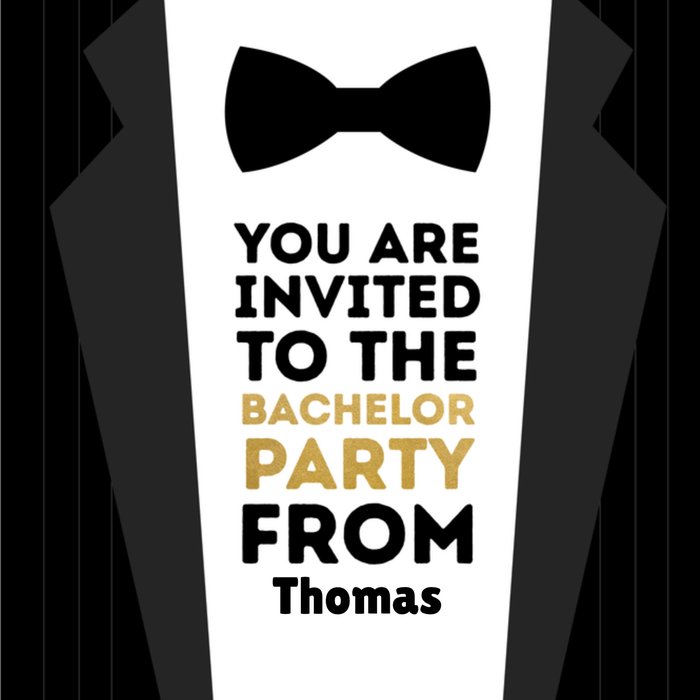 Een leuke bacheloruitnodiging met de tekst: You are invited to the bachelorparty from [Naam].