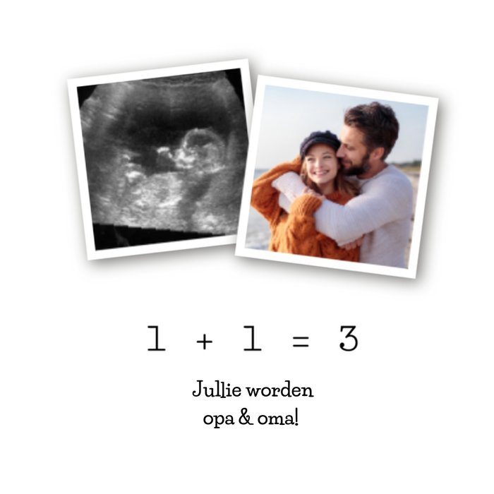 Verras opa en oma met een lieve zwangerschapskaart van Greetz! Op deze leuke kaart staat: 1+1=3 Jullie worden opa & oma! Je kunt twee foto's toevoegen.