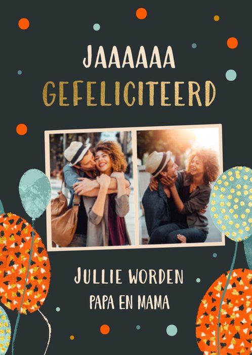 Wat leuk! Je broer krijgt samen met zijn vriendin binnenkort een baby! Stuur daarom deze leuke vrolijke kaart van Greetz. Op de kaart staat: Jaaaa. Gefeliciteerd. Jullie worden papa en mama. Ook kun je twee foto's toevoegen.
