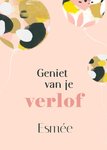 Kaart met daarop illustraties van ballonnen in verschillende kleuren. In sierlijke letters staat de tekst: 'Geniet van je zwangerschapsverlof'.