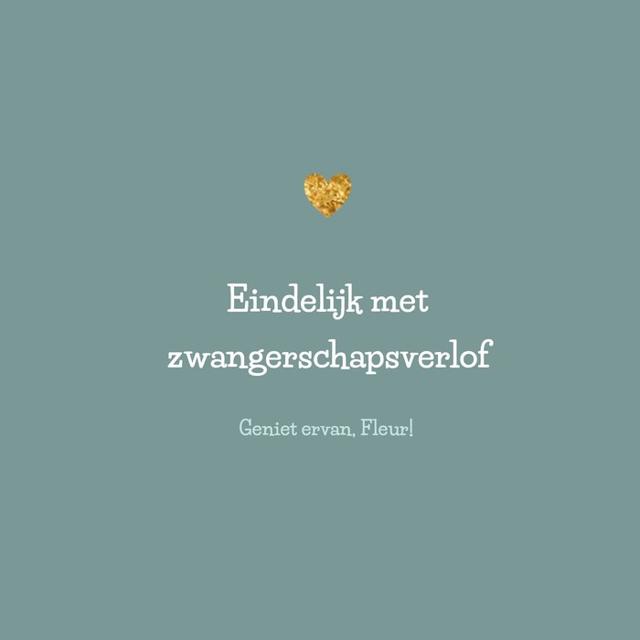 Ken jij iemand die binnenkort met zwangerschapsverlof gaat? Stuur dan een zwangerschapskaartje via Greetz! Op deze kaart staat: Eindelijk met zwangerschapsverlof. Geniet ervan! Ook kun je een naam toevoegen.