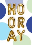 Kaart met blauwe en groene tinten en gouden folie ballonnen: Hooray