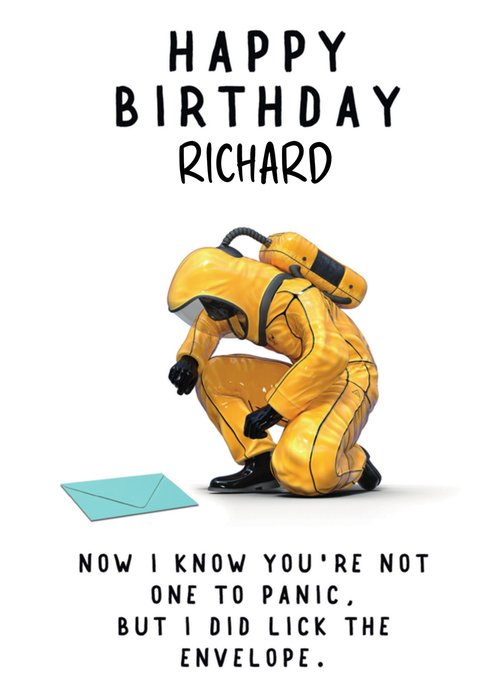 Grappige verjaardagskaart met aanpasbare naam en de tekst: Happy Birthday [naam] now I know you're not one to panic, but I did lick the envelope.
