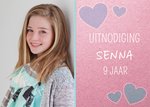 Trendy uitnodiging voor een verjaardagsfeestje. Op de voorkant kan een eigen foto, naam en leeftijd worden toegevoegd.
