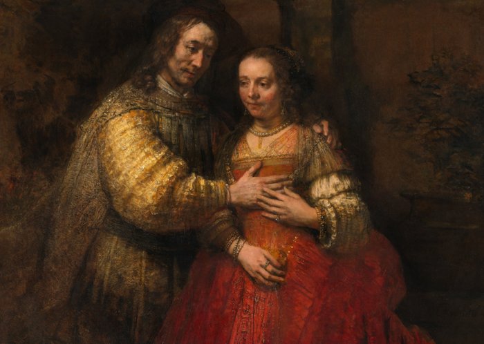 Op deze kunstkaart zie je het bekende schilderij 'Het Joodse Bruidje'. Het Joodse Bruidje is een schilderij van de Nederlandse schilder Rembrandt van Rijn. Het is een donker schilderij waarop je een man een vrouw ziet betasten.