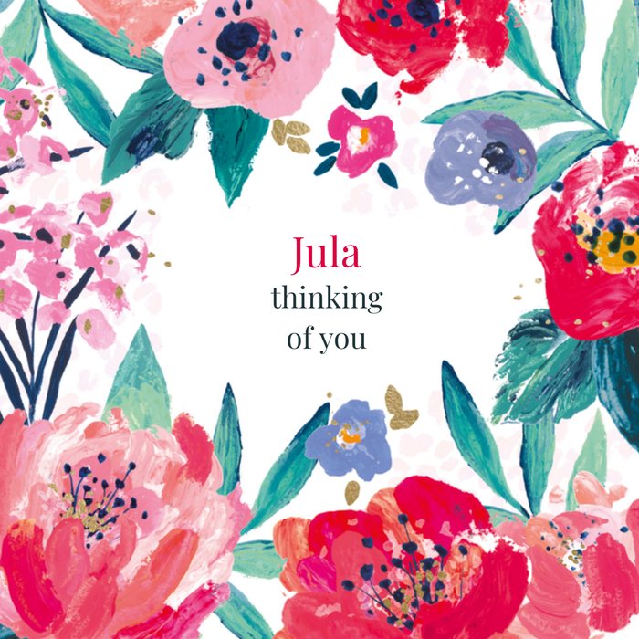 Wie ga jij deze leuke denken aan kaart van Hotchpotch sturen? De kaart is versierd met gekleurde bloemen. Personaliseer de kaart door de naam te wijzigen. Op de kaart staat de volgende tekst: "Thinking of you."