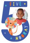Nodig iedereen uit voor de vijfde verjaardag met deze vrolijke, geïllustreerde uitnodiging. Bij de grote blauwe 5 staat een leeuw die met zijn staart de foto van de kleine jarige man omhooghoudt.