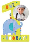 Een eerste verjaardag is altijd bijzonder. Nodig iedereen uit met deze vrolijke, geïllustreerde uitnodiging. Op de grote 1 staat een olifant die een ballon vasthoudt met de foto van de kleine man.