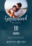 Een blauwe kaart met een tekst geschreven met hippe letters. Hiervan is het jaartal aanpasbaar. Aan de rechterzijde van de kaart kan je zelf een foto toevoegen.