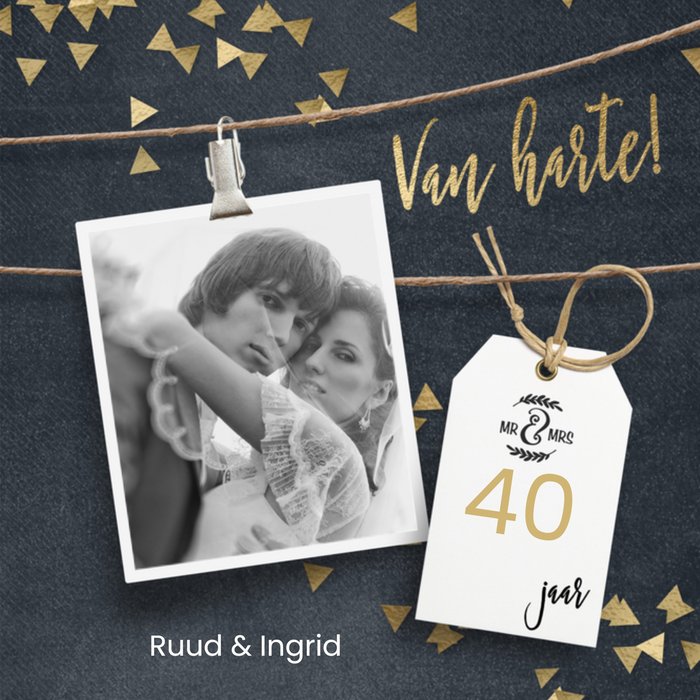 Wauw al zo lang getrouwd! Hoe leuk is het om je ouders daarom te verrassen met een kaart. Op deze kaart gefeliciteerd pap en mam. Ook kun je een foto toevoegen.