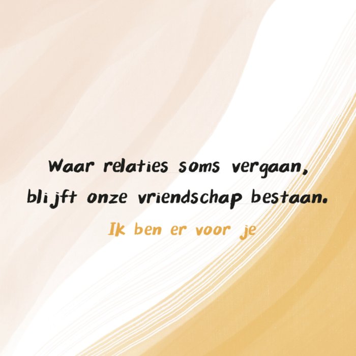 Wil je je vriend of vriendin tijdens hun scheiding even oppeppen? Stuur dan een van onze leuke scheidingskaarten van Greetz. Op deze kaart staat: waar relaties soms vergaan, blijft onze vriendschap bestaan. Ik ben er voor je.