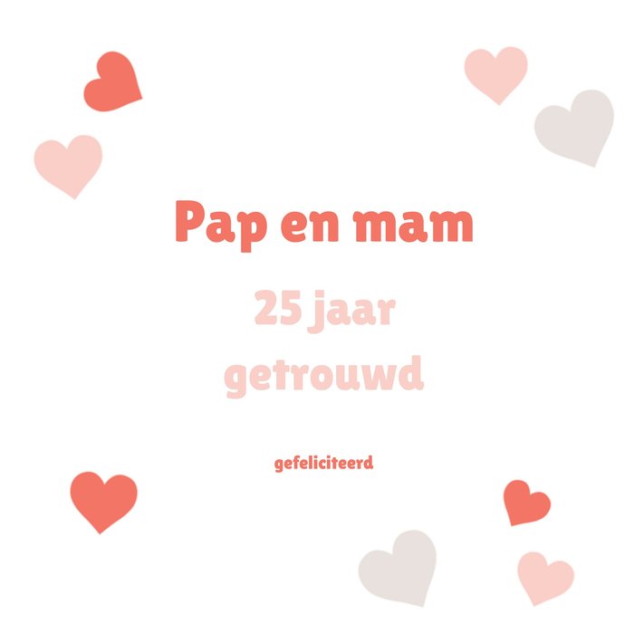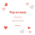 Wauw al zo lang getrouwd! Hoe leuk is het om je ouders daarom te feliciteren met hun jubileum met deze leuke kaart. Ook staat er: Pap en mam. 25 jaar getrouwd. Gefeliciteerd.