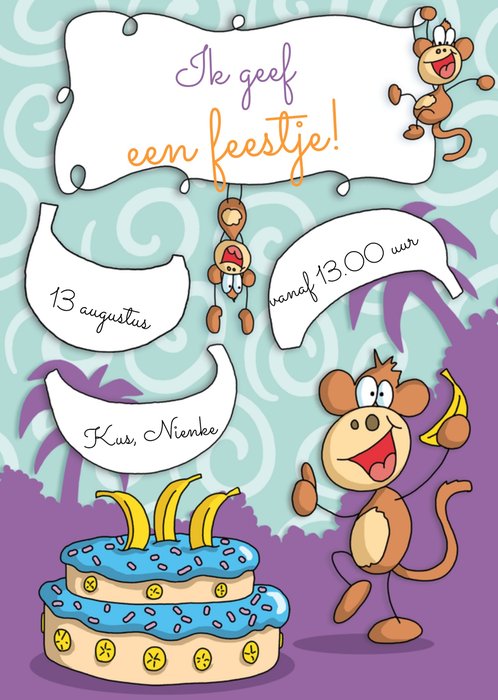 Paarse uitnodiging voor een verjaardag van TMS, met een taart en een aap op de voorkant. Maak de uitnodiging extra persoonlijk door een eigen datum, tijd en naam toe te voegen.