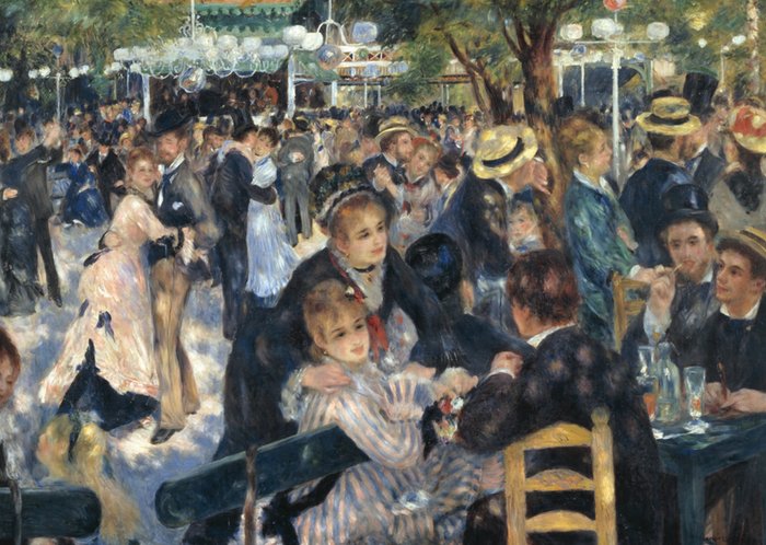 Deze mooie kunstkaart laat een schilderij zien uit de kunststroming: het Impressionisme. Het is een gezellig tafereel waar je een grote groep mensen bij elkaar zit. Ook zie je mensen dansen.