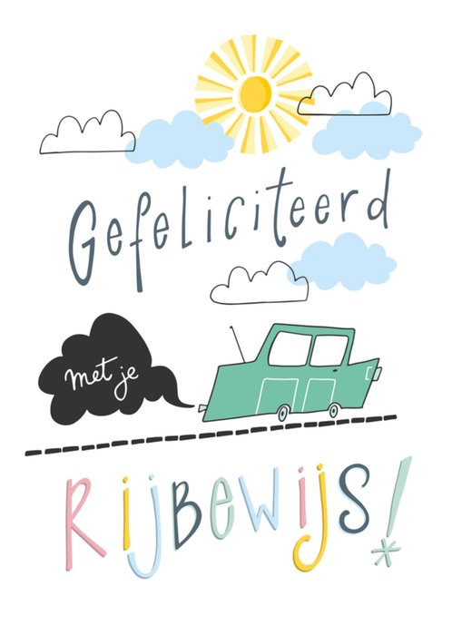 Feliciteer iemand met het behalen van zijn of haar rijbewijs. Op de kaart is een drukke straat vol met verkeer afgebeeld.