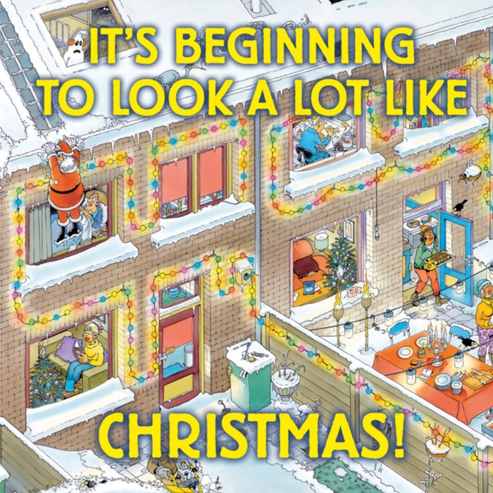 Leuke kerstkaart van Jan van Haasteren met de tekst: It's beginning to look a lot like Christmas!