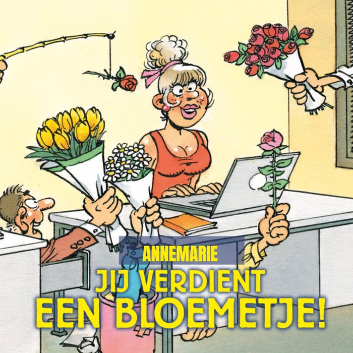 Stuur je collega deze leuke kaart met tekst: Jij verdient een bloemetje. Ook kun je een naam toevoegen.