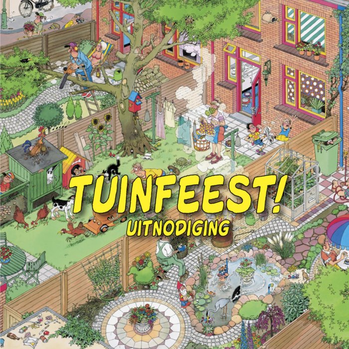 Grappige uitnodiging van Jan van Haasteren voor een tuinfeest.