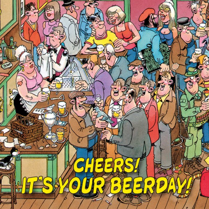 Ken jij iemand die jarig is en wel een biertje lust? Feliciteer de jarige met deze gezellig drukke kaart. Onderaan de kaart staat de tekst "Cheers! It's your beerday!".