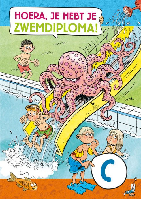 Illustratieve zwemdiploma kaart met een grumpy octopus, kinderen en de tekst: 'Hoera, je hebt je zwemdiploma!'. Verras iemand met deze grappige en kleurrijke zwemdiploma kaart van Jan van Haasteren Junior.