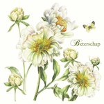 Op deze witte vierkante beterschapskaart staan witte bloemen. Rechts van de bloemen vliegt een klein vlindertje. Onder dit vlindertje staat de tekst 'Beterschap' geschreven.