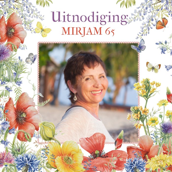 Tijd voor een feestje? Een vrolijke uitnodiging met bloemen op de voorkant. Voeg in het kader jouw eigen foto toe!