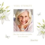 Mooie condoleancekaart met foto en naam. Op de kaart staat: Veel sterkte met het verlies van jullie lieve moeder.