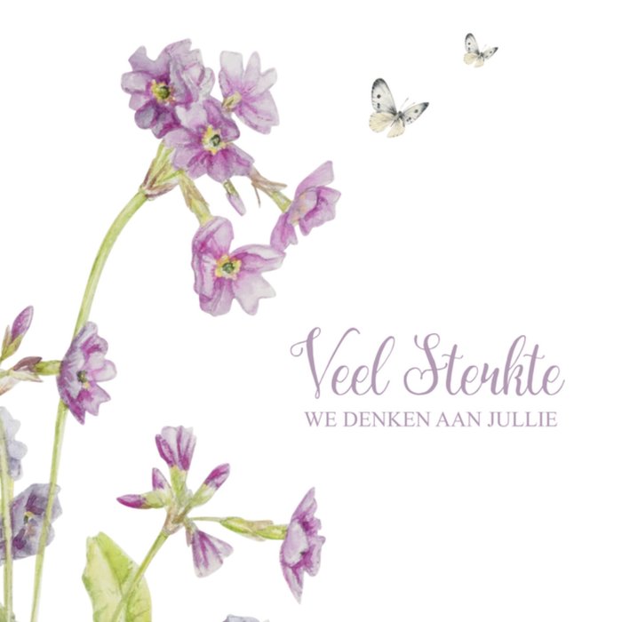 Een moeilijke tijd. Laat met dit kaartje weten dat je aan iemand denkt. Op de kaart staat de tekst: "Veel sterkte we denken aan jullie."