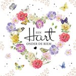 Laat weten dat je aan iemand denkt met deze kaart van Janneke Brinkman. Op de kaart staat: een hart onder de riem. De tekst staat in het midden van een bloemenhart.