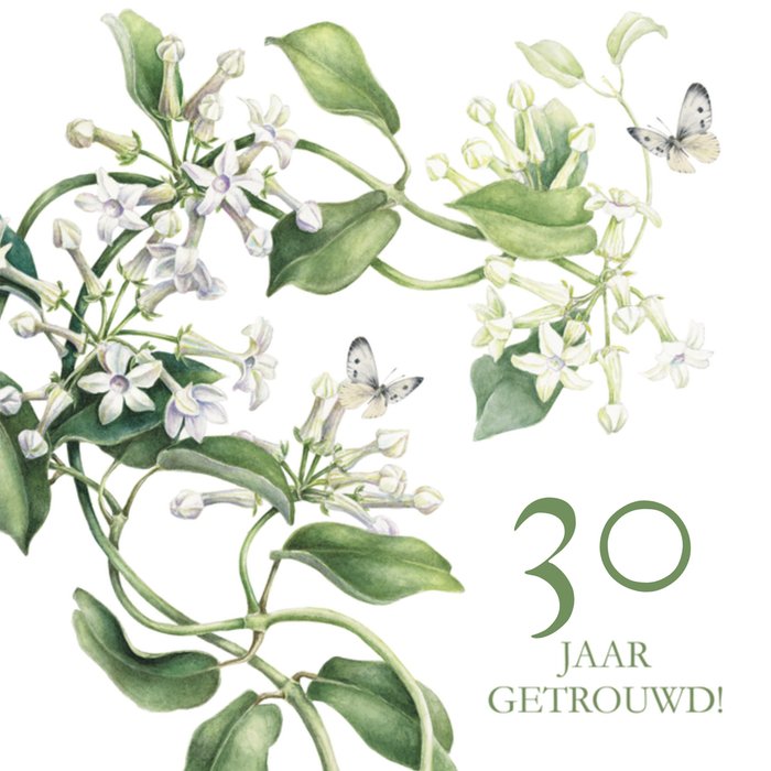 Op deze wenskaart van Janneke Brinkman staan mooie witte bloemen afgebeeld. Ook staat er met grote letters: 30 jaar getrouwd.
