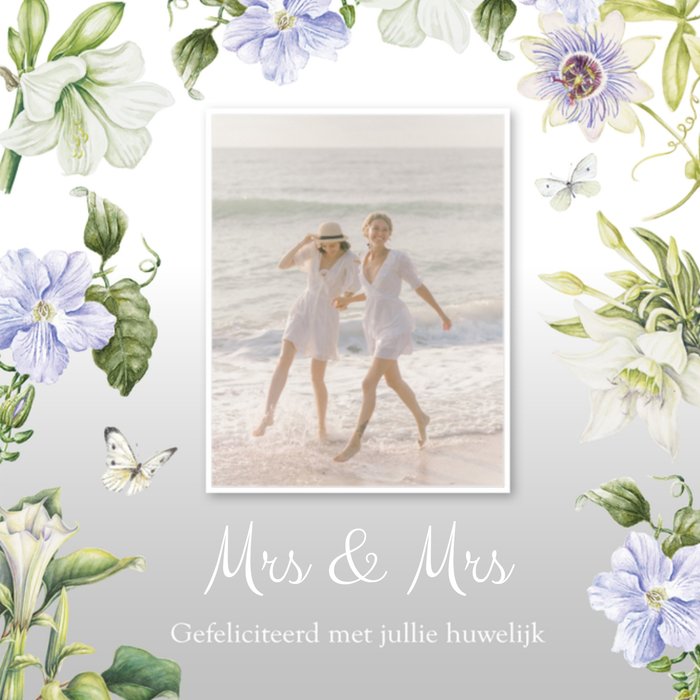 Mooie fotokaart met bloemen en de tekst: Mrs & Mrs gefeliciteerd met jullie huwelijk