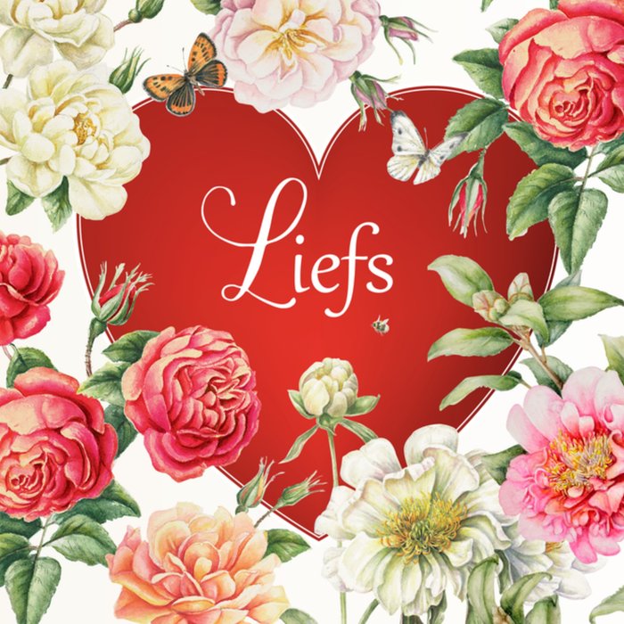 Mooie rode kaart met bloemen om je moeder tijdens moederdag eens flink mee te verrassen en een groot rood hart met de tekst: "Liefs."