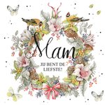 Heb jij de liefste moeder? Stuur haar dan dit lieve kaartje. Op het kaartje is een grote bloemenkrans, vogels en vlinders te zien. Midden in de krans staat de tekst "Mam jij bent de liefste!".