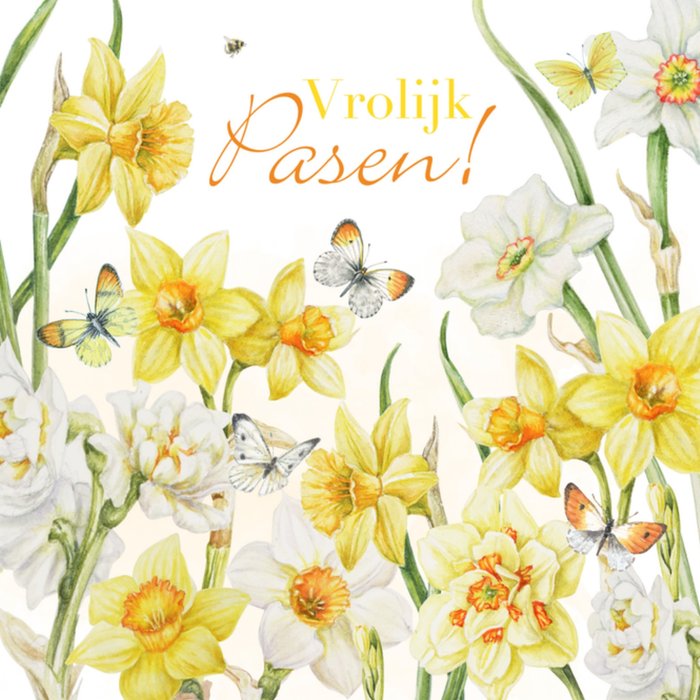 Wens iemand een vrolijk Pasen met dit fleurige kaartje met gele narcissen en vlinders.