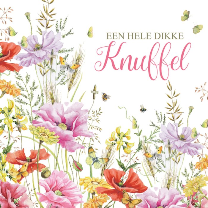 Verdient iemand een knuffel? Stuur dan dit fleurige kaartje. De kaart staat vol met bloemen en vlinders. Boven aan de kaart staat de tekst "Een hele dikke knuffel".