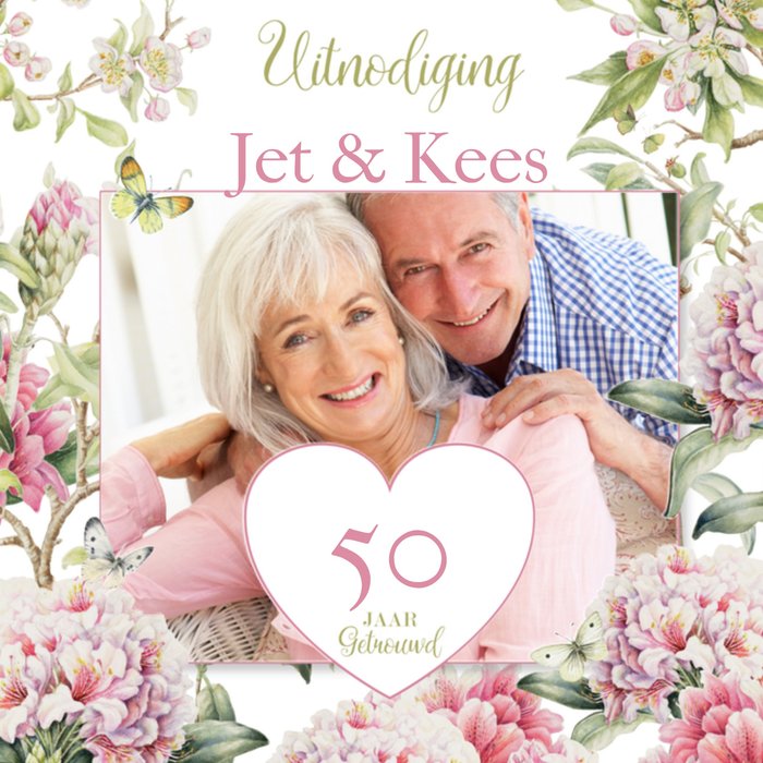 Gefeliciteerd met jullie jubileum! Geven jullie een feestje? Nodig iedereen uit met deze kaart. Je kunt de tekst gemakkelijk aanpassen. Op de voorkant staan bloemen rondom jullie eigen foto.