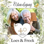 Gefeliciteerd met jullie jubileum! Geven jullie een feestje? Nodig iedereen uit met deze kaart. Je kunt de tekst gemakkelijk aanpassen. Op de voorkant staan bloemen rondom jullie eigen foto.