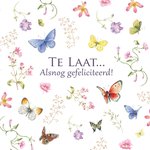Wat een fleurige te laat verjaardagskaart van Janneke Brinkman. De kaart staant vol met bloemen en vlinders. Ook staat er: