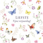 Wat een fleurige verjaardagskaart van Janneke Brinkman. De kaart staat vol met bloemen en vlinders. Ook staat er: Liefste. Fijne verjaardag!