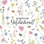 Wie ga jij verrassen met deze klassieke en schattige kaart van Janneke Brinkman? Op de kaart zie je allemaal kleine gekleurde bloementjes met de tekst: "Hartelijk gefeliciteerd!."