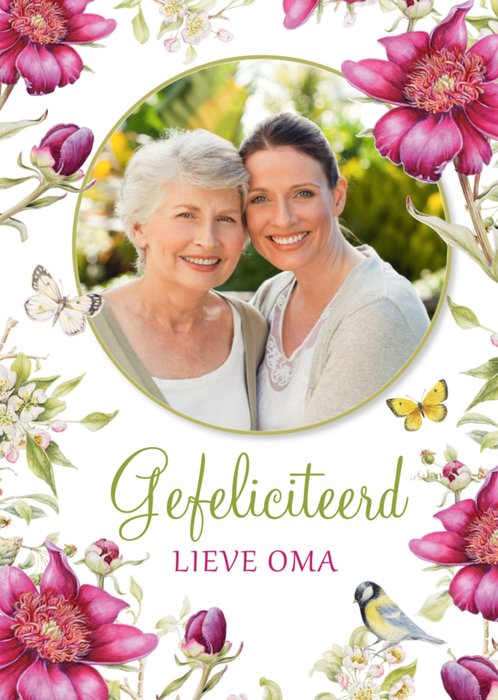 Prachtige verjaardagskaart met bloemen, vlinders, aanpasbare foto en de tekst: 'Gefeliciteerd lieve oma'. Verras je oma met deze mooie verjaardagskaart van Janneke Brinkman.