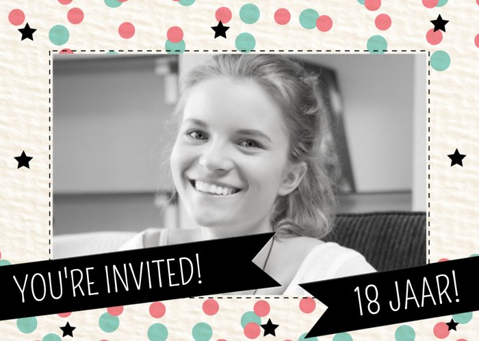 Witte en trendy uitnodiging van Greetz met confetti. Op de uitnodiging kan een eigen foto en leeftijd worden toegevoegd.