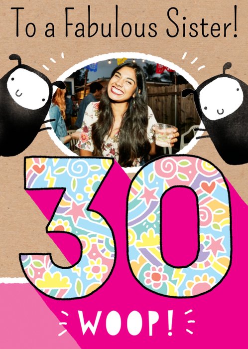 Vrolijke fotokaart met leeftijd en de tekst: To a fabulous sister! Woop!
