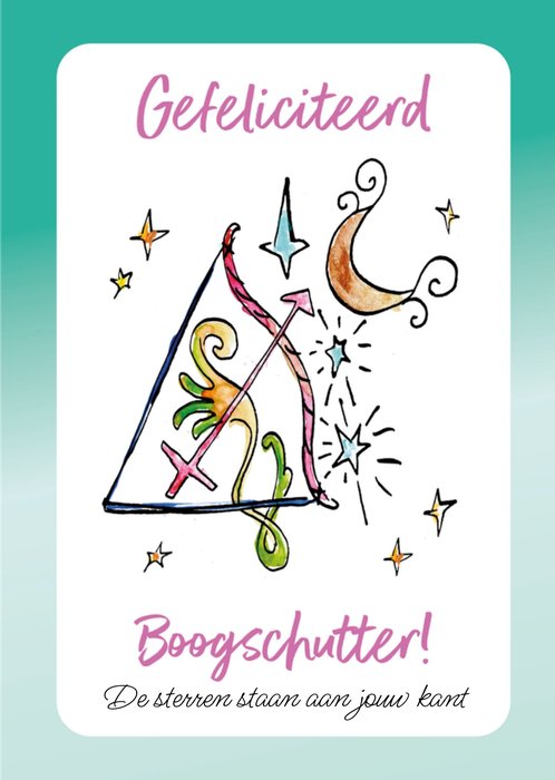 Kleurrijke verjaardagskaart met sterrenbeeld en aanpasbare tekst van Jill. Verras een Boogschutter met deze leuke kaart.