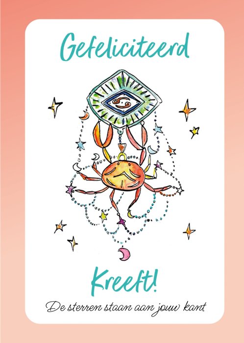 Kleurrijke verjaardagskaart met sterrenbeeld en aanpasbare tekst van Jill. Verras een Kreeft met deze leuke kaart.